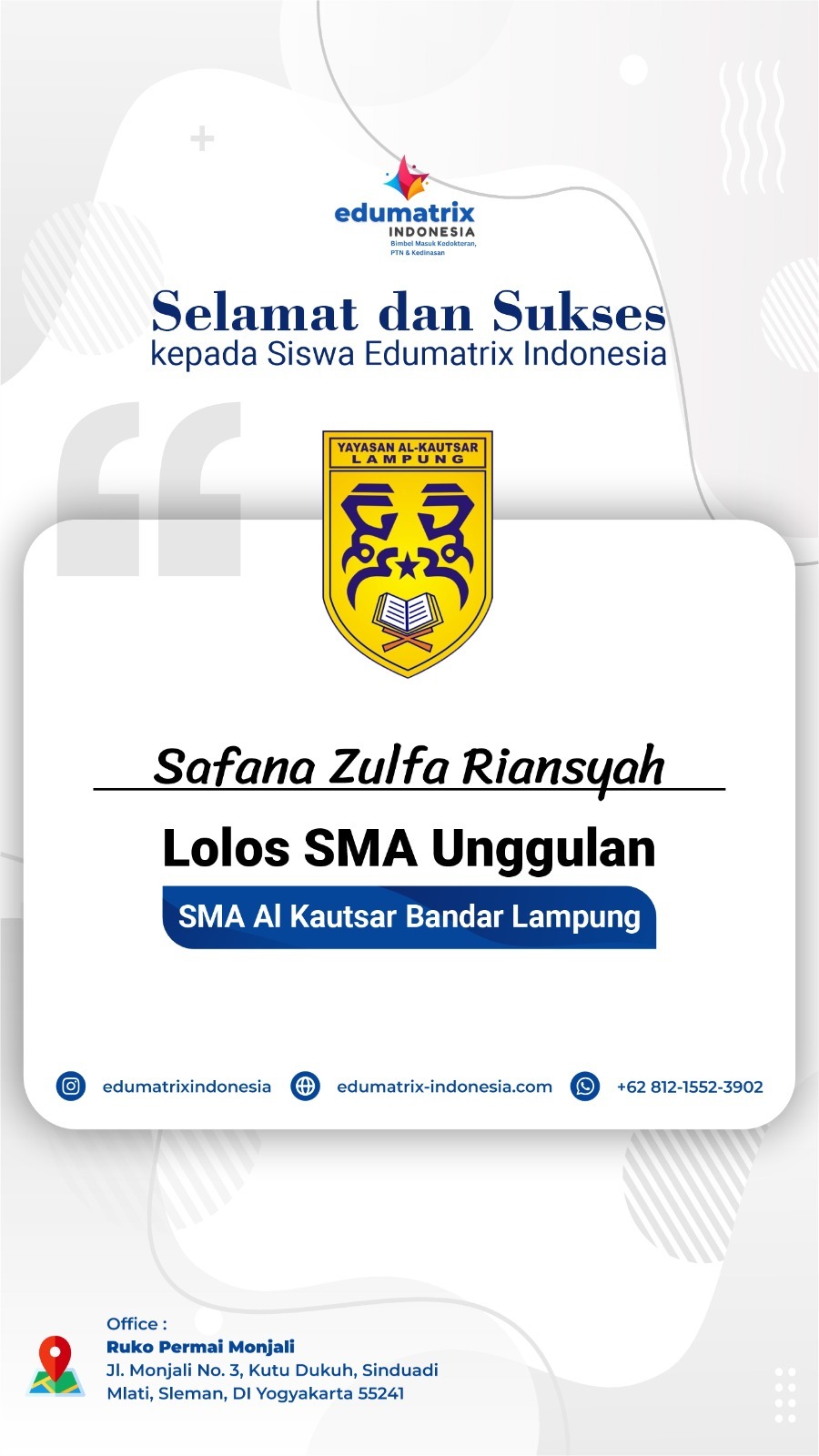 Dengan bimbingan dari Edumatrix Indonesia, maka kamu bisa mendapatkan edukasi materi, tips & trik menjawab tes hingga menempa mental sebaik mungkin. Semua adalah modal yang dibutuhkan untuk bisa meningkatkan kesempatan terbaikmu untuk bisa sukses di sekolah. Ditambah dengan dukungan tenaga pengajar profesional yang siap membantu untuk mewujudkannya.